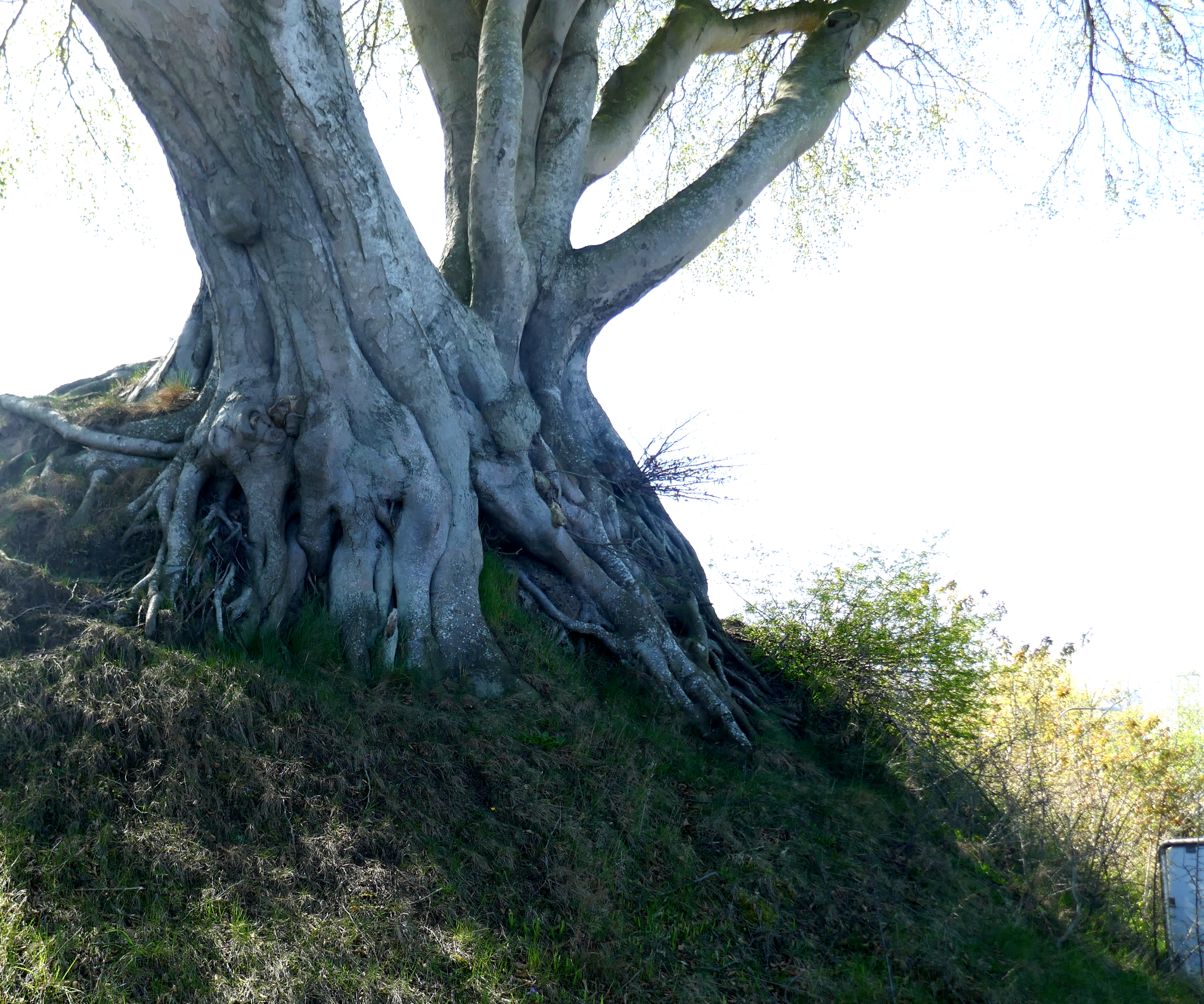Træets rødder har en nlæsten kropslig karakter. Det mytiske har med fornemmelsen af dets lange liv at gøre.